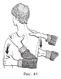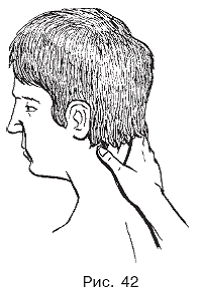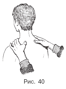 При массировании шейного отдела используется растирание фалангами пальцев и опорной частью кисти. Последний вид используется для массирования нижнего шейного отдела. От того, какие из пальцев, большой или четыре остальных, выполняют массажный прием, зависит положение кисти. При растирании большими пальцами кисти рук немного развернуты, пальцы находятся под углом 45° по отношению к большому пальцу (рис. 40). При растирании большими пальцами кисть руки упирается четырьмя остальными пальцами в массируемый участок и фиксируется. Если массажный прием выполняется четырьмя пальцами, то большой при этом максимально отводится назад и фиксируется.