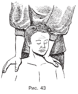 Подталкивание выполняется кончиками пальцев. Этим приемом завершается серия потряхиваний. После этого ладонями проводят по всему массируемому участку, начиная от затылочной области до середины спины и от подбородка до середины грудины. Массирование заканчивают мягкими поглаживающими движениями (рис. 43).