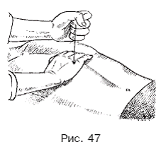 Перкуссионный массаж выполняется с помощью постукивания. Он помогает восстановить нормальный дыхательный процесс и улучшает вентиляцию в бронхах и легких. Данный вид массажа выполняется на спине и груди. Для этого массажист помещает ладонь левой руки на массируемый участок, а правой рукой наносит удары (рис. 47). Они должны быть ритмичными и выполняться в среднем темпе (50—60 ударов в минуту). Сначала следует провести массирование грудной области, а затем спинной. Движения идут в продольном направлении прямолинейно от нижней реберной дуги до подключичной области, от нижнего края лопаток по лопаткам до верхней зоны. Все удары проводятся на симметричных участках.