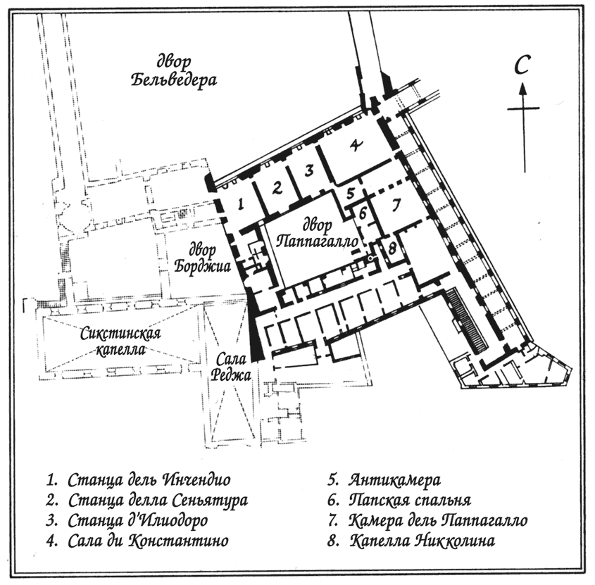 Эти комнаты в северном крыле дворца были оформлены в предыдущем десятилетии Пинтуриккьо, который расписал стены и плафоны сценами на сюжеты из Библии и из житий святых, в том числе святой Екатерины, облик которой был списан с белокурой Лукреции Борджиа. Поскольку всюду на стенах Пинтуриккьо изобразил также самого Александра и гербовый щит Борджиа, убранство покоев представлялось Юлию оскорбительным. Париде предложил сбить фрески со стен, но понтифик возразил, что подобное глумление ни к чему. Вместо этого он планировал перебраться выше, на третий этаж дворца, в галерею из смежных комнат, откуда открывался еще более роскошный вид на созданный Браманте новый «двор Бельведера». Эти покои, включая зал для аудиенций и библиотеку, нуждались в отделке.