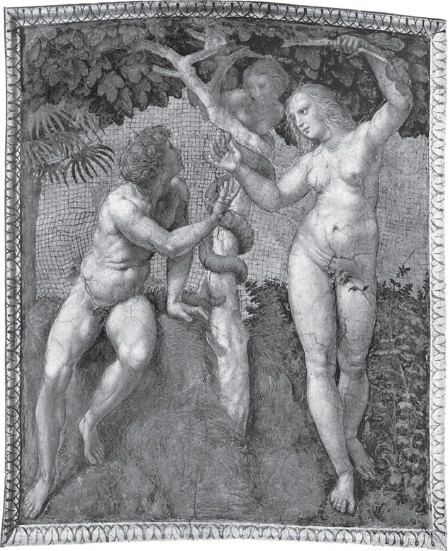 Первое панно, «Грехопадение», иллюстрирует эпизод, знакомый Рафаэлю по произведениям других живописцев, например по фреске Мазолино в капелле Бранкаччи во Флоренции. В трактовке Рафаэля Ева протягивает Адаму миниатюрный плод, а змей, овившись вокруг ствола древа познания, наблюдает за ними из ветвей. В продолжение мизогинической средневековой традиции змей предстает в женском облике, с длинными волосами и обнаженной грудью – эдакой русалкой с кольцеобразным хвостом вместо плавника.