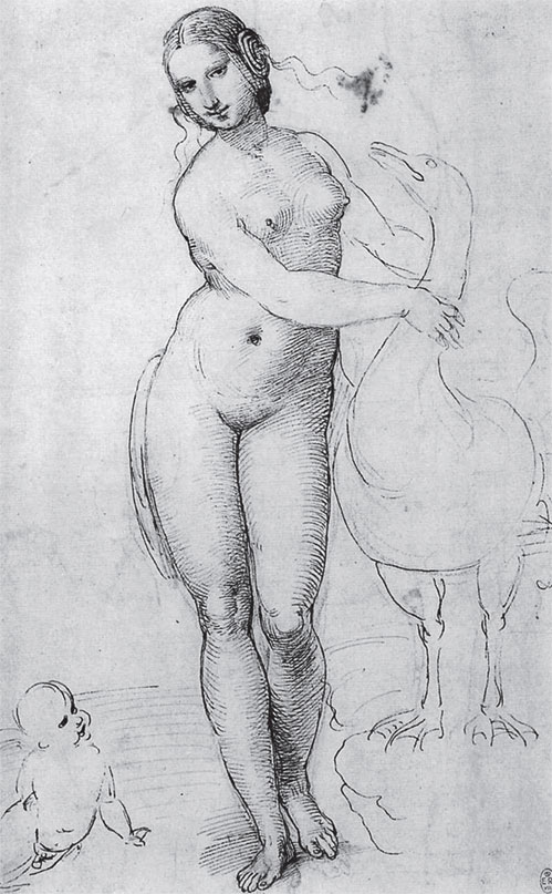 Хотя Леонардо настороженно относился к художникам младшего поколения, в частности к Микеланджело, он, видимо, позволил Рафаэлю ознакомиться со многими своими рисунками – быть может, потому, что молодой живописец был связан с его большим другом Браманте. Так или иначе, живописцу удалось увидеть и сделать набросок с эскиза Леонардо к полотну «Леда и лебедь», которым он воспользовался, прорабатывая позу Евы в Станце делла Сеньятура. Ева Рафаэля – зеркальное отображение, а не прямая копия леонардовской Леды: к такой уловке художники часто прибегали, чтобы завуалировать слишком похожий образ.