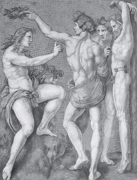 Содома, как и Марсий, вскоре был побежден. «Аполлон и Марсий» – последняя сцена, которую он напишет в Ватиканском дворце: в начале 1509 года он будет освобожден от своих обязанностей, его выживут по той простой причине, что Рафаэль ярче проявит себя как в композиции, так и в исполнении. И если Содома наносил множественные мазки а секко, более юный и менее опытный живописец показал немалое мастерство в овладении техникой буон фреско.