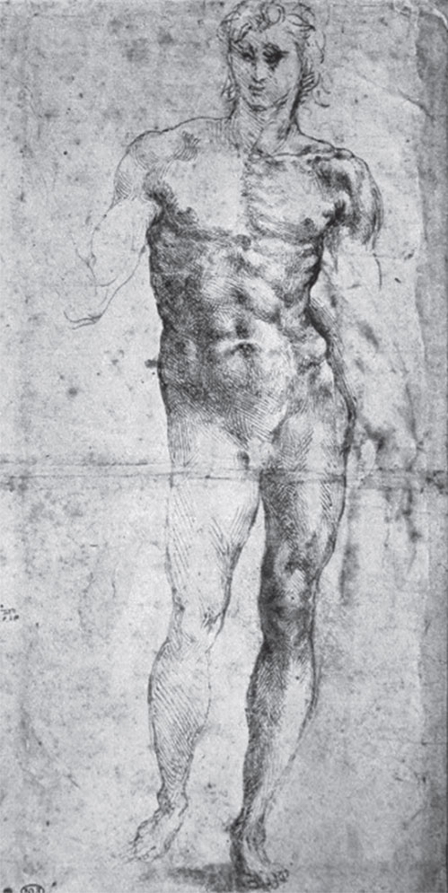 Как свидетельствуют некоторые ранние наброски Микеланджело, впервые оказавшись в Риме в 1496 году, он также ходил по улицам с альбомом. В Лувре хранится рисунок с изображением небольшой статуи фонтана Giardino Cesi: карапуз тащит на плече бурдюк. Во время этих прогулок была также запечатлена статуя Меркурия на Палатинском холме. Как и Гирландайо, мастер делал эти рисунки, чтобы разнообразить каталог классических поз для своих живописных произведений и скульптур. Одна из таких обнаженных мраморных фигур, установленная на надгробии, судя по рисунку, могла подсказать позу Давида.