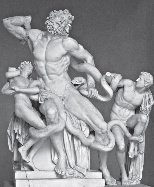 Высеченная артелью из трех скульпторов на острове Родос около 25 года до н. э., эта мраморная группа изображает троянского жреца Лаокоона и двух его сыновей, которые борются с морскими змеями, насланными Аполлоном, чтобы их задушить, после того как Лаокоон – изрекший знаменитую фразу «Боюсь данайцев, и дары приносящих» – попытался предостеречь троянцев, чтобы те не открывали лаза в брюхе деревянного коня. В 69 году н. э. статую привез в Рим император Тит, и впоследствии она на много веков затерялась в городе среди древних руин. В 1506 году статую (без утраченной Лаокооном правой руки) откопали на винограднике Эсквилинского холма, принадлежавшем некоему Феличе де Фредди. Микеланджело присутствовал при извлечении скульптурной группы из земли, оказавшись на винограднике по поручению Юлия, чтобы помочь Джулиано да Сангалло ее опознать.