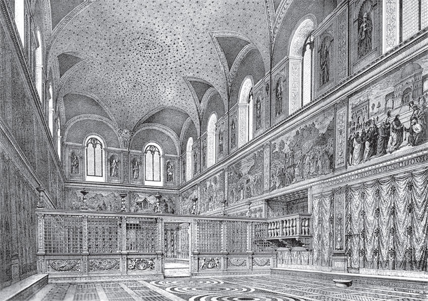 Реконструкция внутреннего вида Сикстинской капеллы с изначальным плафоном из монографии Эрнста Штейнмана «Die Sixtinische Kapelle» («Сикстинская капелла»)