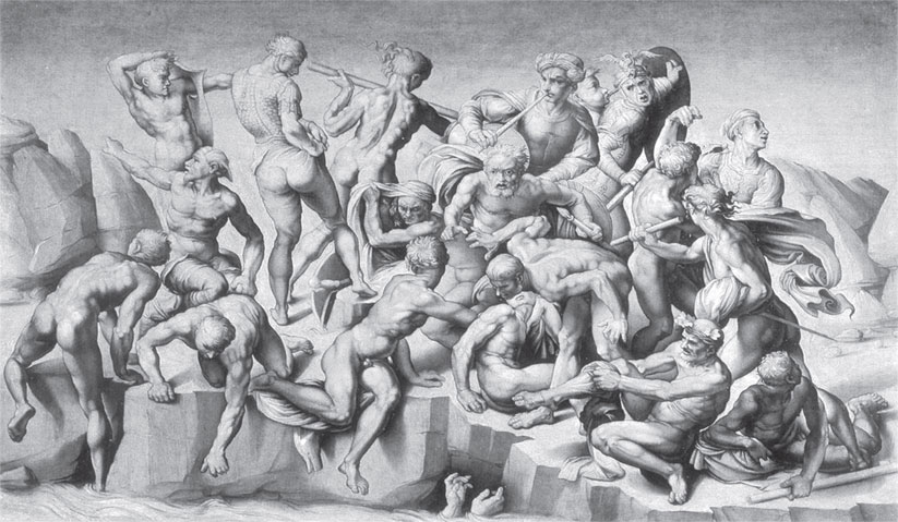 Фрески почти семи метров в высоту и шестнадцати с половиной в длину чуть ли не в два раза превосходили «Тайную вечерю» Леонардо. Микеланджело поручалось изобразить битву при Кашине, в которой в 1364 году были побеждены пизанцы, а Леонардо должен был воссоздать сцену битвы при Ангиари, иллюстрируя победу Флоренции над Миланом в 1440 году. Микеланджело приступил к выполнению эскизов в помещении, которое выделили ему в госпитале при церкви Сант-Онофрио, а его выдающийся соперник тем временем обосновался на безопасном расстоянии в базилике Санта-Мария Новелла. Оба не один месяц работали в полной секретности, а в начале 1505 года представили плоды своих трудов: полноразмерные эскизы черным мелом, отображавшие очертания и общий замысел двух композиций. Эти масштабные рисунки, по которым, как по лекалу, должны были создаваться фрески, называли картонами – от cartone, больших листов, на которые они были нанесены. Когда эскизы, каждый площадью сто два квадратных метра, предъявили для всеобщего обозрения, это вызвало во Флоренции, можно сказать, всплеск религиозных настроений. Портные, банкиры, торговцы, ткачи и, конечно же, художники устремились в Санта-Мария Новелла, где оба картона были выставлены, словно священные реликвии.