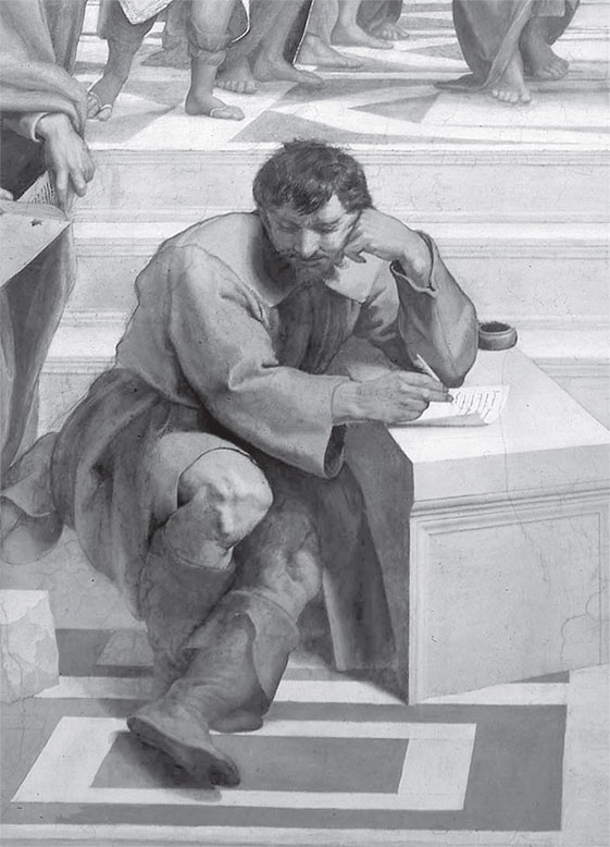 Если Микеланджело действительно послужил моделью для Гераклита, это был не вполне однозначный комплимент. Гераклит Эфесский, известный как Гераклит Темный или «Рыдающий философ», считал, что мир пребывает в состоянии непрерывного изменения; свои мысли он суммировал в двух своих самых знаменитых высказываниях: «Невозможно дважды войти в одну и ту же реку» и «Солнце каждый день новое». Однако отнюдь не его философские взгляды заставили Рафаэля придать ему черты Микеланджело, а скорее вошедший в легенды тяжелый характер Гераклита и его презрительное отношение к соперникам. Он крайне уничижительно отзывался о своих предшественниках – Пифагоре, Ксенофане и Гекатее. Досталось от него даже Гомеру: Гераклит утверждал, что слепого поэта не мешало бы отстегать хлыстом. Жителей Эфеса мрачный философ тоже не жаловал. Их стоило бы перевешать всех до единого, писал он.