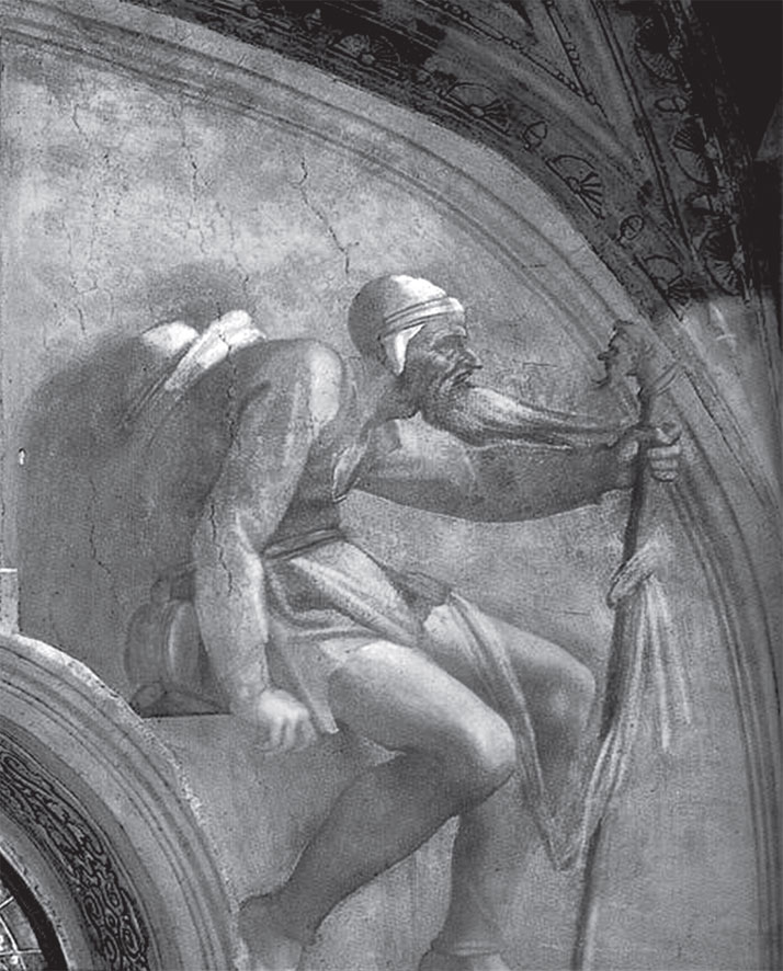 Не исключено, что после разгрома в Равенне Микеланджело тоже подумывал о бегстве. Однажды он уже обращался в бегство, когда в 1494 году к Флоренции подошли армии Карла VIII, а позднее, во время осады города в 1529 году, он, будучи ответственным за его укрепление, скрылся из него на некоторое время: в обоих случаях он проявил робость, которая впоследствии смущала и озадачивала исследователей. Однако в 1512 году он, похоже, решил остаться на месте – особенно изумляет то, что в такие неспокойные времена он включил в композицию фрески несколько очень неоднозначных фигур.