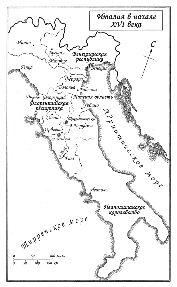 Несмотря на весь свой громоздкий антураж, вскоре эта армия уже была далеко: каждый день она снималась с лагеря за два часа до рассвета и до темноты успевала пройти до тринадцати километров. В пути папа и Браманте осматривали всевозможные замки и фортификации. Когда экспедиция добралась до Тразименского озера, в ста тридцати километрах к северу, Юлий сделал однодневную остановку ради двух своих излюбленных занятий: хождения под парусом и рыбалки. Суда он полюбил с тех пор, как мальчишкой зарабатывал тем, что грузил лук на корабль, курсировавший между Савоной и Генуей. Теперь же его швейцарские пехотинцы били в барабаны и трубили в трубы, выстроившись на берегу, пока он совершал многочасовую водную прогулку. Чтобы совместить приятное с полезным, он также посвятил время посещению своей дочери Феличе и ее супруга в их замке. И все равно его войско меньше чем за две недели добралось до высоко вздымающихся холмов и глубоких долин Умбрии, совсем близко подойдя к своей первой цели: обнесенному крепостной стеной, высоко стоящему городу Перуджа.