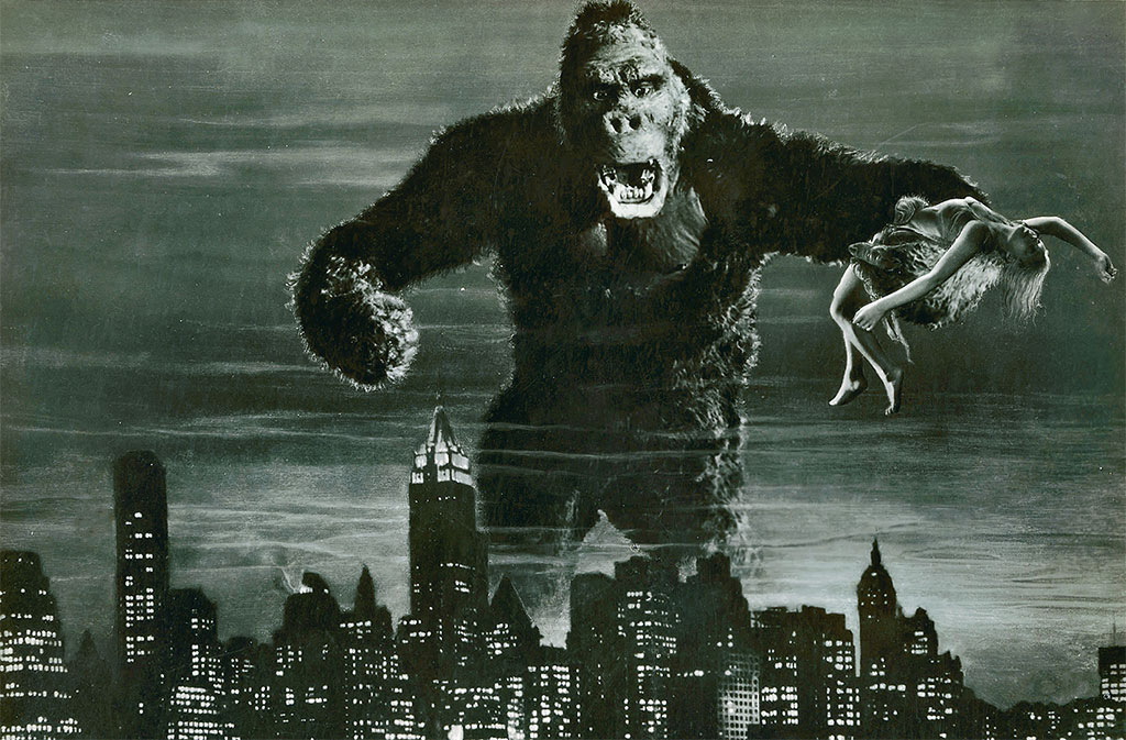 Один из самых устрашающих и одновременно с этим обожаемых монстров, которому мы сочувствуем, хотя он принципиально лишен обаяния, – это Кинг Конг. Не будет преувеличением сказать, что первый фильм ужасов про Кинг Конга, фильм 1933 года Мериана Купера и Эрнеста Шодсака, даже не пытается завуалировать тему, как, например, это часто делали в фильмах про вампиров или зомби 30-х. Кинг Конг предстает если не абсолютным злом, то чистым воплощением жестокости. В первых кадрах присутствуют сцены на острове, где Кинг Конг быстро расправляется с местными жителями, он их поедает, давит и не испытывает к ним абсолютно ничего. Но такой фильм публику бы не заинтересовал, поэтому Кинг Конг, или, как на протяжении всего фильма его называют, «чудовище», млеет от красавицы и не может ее убить.