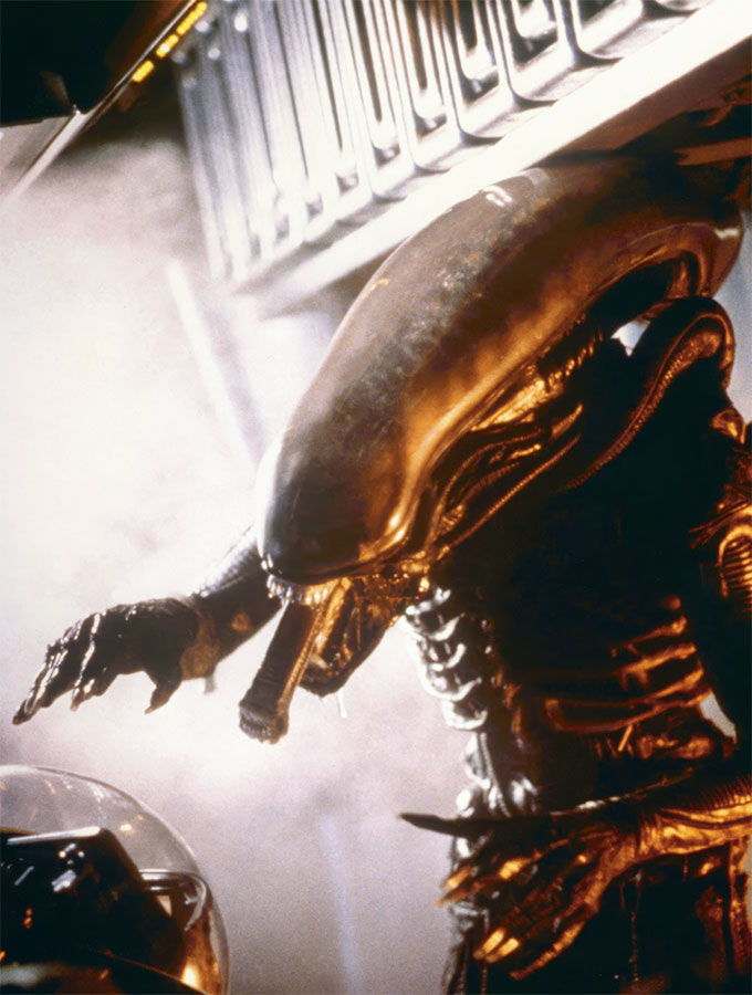 Говоря о страхах из космоса, невозможно не вспомнить фильм Ридли Скотта «Чужой» 1979 года. Культовый фильм, который запомнился многим не только пугающей атмосферой и напряженным сюжетом, но и не менее пугающим визуальным рядом, впечатляющим сценарием Дэна О’Бэннона и Рональда Шусетта и дизайном внутренних декораций космического корабля, созданных Роном Коббом. Но, конечно, в первую очередь «Чужой» знаменит своим монстром, за визуализацию которого отвечал Ганс Руди Гигер, швейцарский художник, представитель фантастического реализма. Его работы также можно увидеть в картинах «Некроном IV», «Ли», «Машина рождения», «Дюна», «Атомные дети» и «Нью-Йорк».