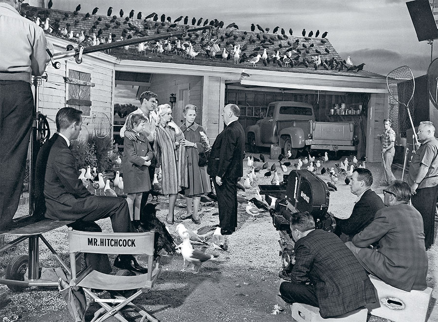 В съемке участвовали живые птицы, от механических пришлось отказаться из-за того, что при движении в кадре они выглядели фальшиво. Дрессировщик Рэй Бервик прибегнул к помощи звероловов. Так, при отлове птиц в Аризоне сетями поймали 10 тысяч ворон. Именно они легче всего поддавались дрессировке, в отличие от строптивых чаек. Актерам на съемках доставалось меньше заботы, чем птицам, особенно Типпи Хедрен, исполнившей главную женскую роль. Одной из самых тяжелых сцен для нее оказался практически финальный эпизод с птицами на чердаке, где забаррикадировались главные герои. По сюжету Мелани слышит странные звуки, идет на чердак и подвергается нападению. Вокруг съемочной зоны построили огромную клетку, в которой находились реквизиторы, напускавшие на актрису птиц. Только в день съемок она узнала, что птицы будут реальными, а не механическими. Съемки двухминутного эпизода заняли 7 дней, актриса получила ранения, и вскоре ей потребовалась госпитализация из-за чрезмерного изнеможения. По слухам, Хичкок так издевался над ней из-за того, что актриса отвергла его ухаживания. В мемуарах 2016 года Типпи открыто обвинила Альфреда в домогательствах. На аналогичный опыт ссылалась Джанет Ли на съемках «Психо», где сцену убийства Хичкок снимал семь дней, во время которых на актрису пускали ледяную воду для более пронзительного крика, что глубоко травмировало Ли. А ее дублера, Марли Ренфро, в 1988 году нашли убитой в ванной комнате – маньяк хотел повторить знаменитую сцену из «Психо».