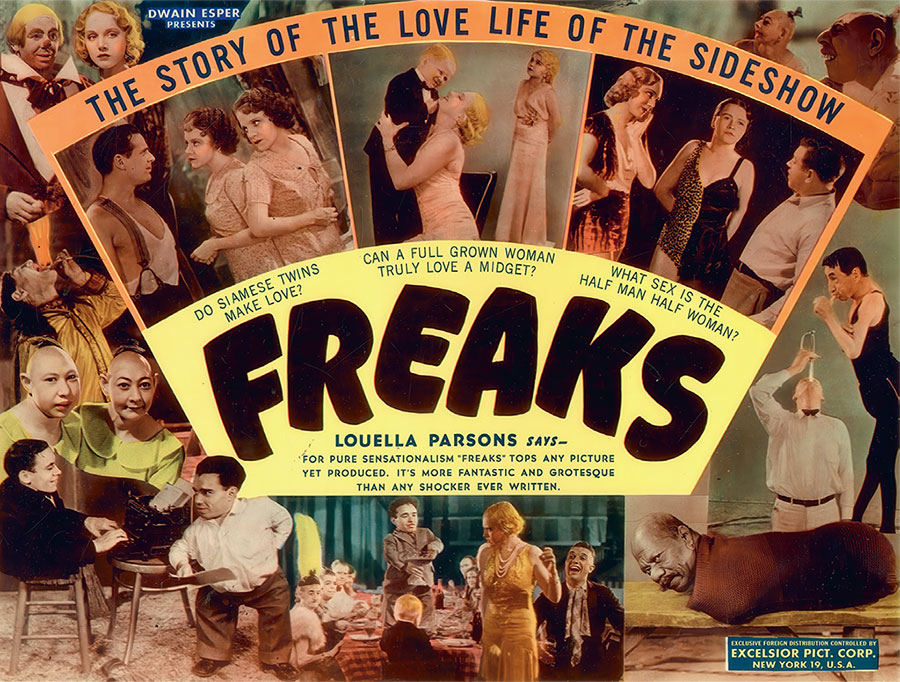Одним из первых боди-хорроров можно считать фильм Тода Браунинга «Уродцы». Выход фильма в 1932 году во время Великой депрессии можно считать почти чудом. Зрители с первых сеансов были шокированы, критики ругали картину, прокат провалился, и ее запретили к показу. Не стоит забывать, что в 1930 году был принят этический кодекс Хейса – свод цензурных правил, определивший стилистику кино эпохи «Золотого века Голливуда». Но в XXI веке, когда зрители массового кино видели многое не только на экранах, но и в жизни, «Уродцы» обретают тот гуманистический посыл, с которым снимал его Браунинг. Порог восприятия отклонений стал выше, что позволило разглядеть сквозь физическую инаковость героев их уникальные характеры, находчивость и образ жизни.