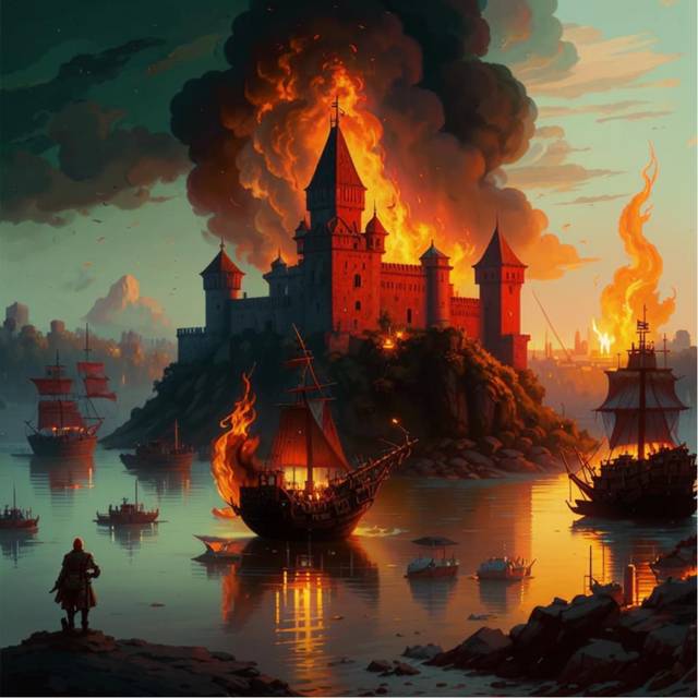— Давай!!! — сосуды с зажигательной смесью полетели к замку на острове, искря и разбрасывая огненные брызги.