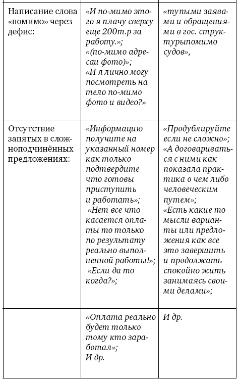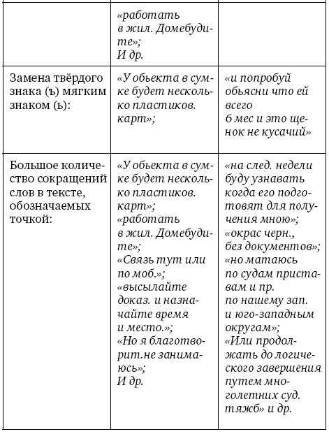 Для исследования совпадений авторской орфографии и пунктуации была произведена выборка систематических (встречающихся не менее двух раз в тексте) ошибок автора. Выявленные особенности были перенесены в таблицу 14, куда были перенесены выявленные совпадения с образцами свободного текста Н. В., которыми является материал под названием «Текст сообщений личной почты Н. В.». При сопоставлении учитывался тот факт, что «Алексей Ш.» обозначает себя как мужчина, а автороведческая экспертиза в криминалистике признаёт факт наличия в свободно написанных документах гораздо большего числа выразительных, отличительных, индивидуальных стилистических приёмов конкретного автора.