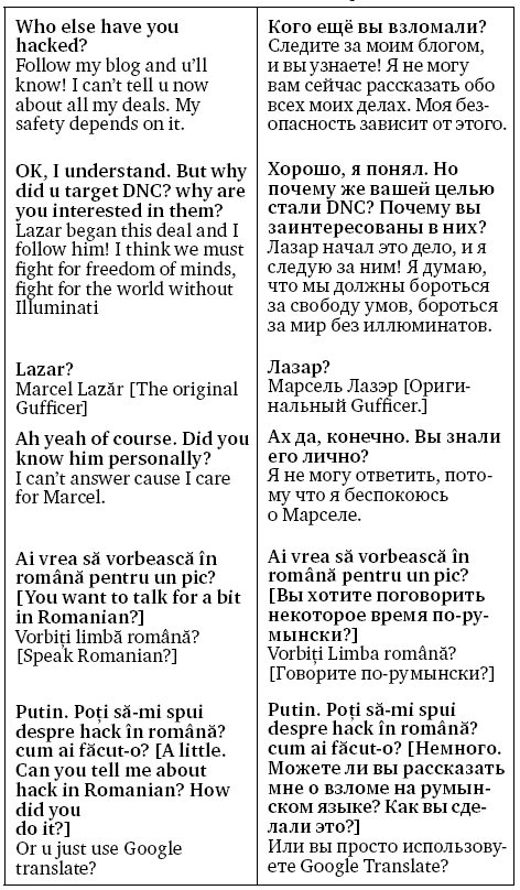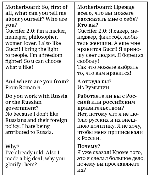 Возможно, он представляет собой самоучку, но присвоение никнейма своего известного предшественника – румынского хакера Гуччифера (Марчела (Марселя) Лехеля) – и выражение личной обеспокоенности за его судьбу говорят о том, что Гуччифер 2.0. является не только его учеником, но и преемником. Соответственно, он продолжает начатую Марселем Лазаром миссию «спасения мира». Если бы этот хакер присвоил себе известный никнейм предшественника просто так, незаслуженно и без его разрешения, то это обязательно вызвало бы негативную реакцию со стороны хакерского сообщества и первого носителя почётного никнейма.