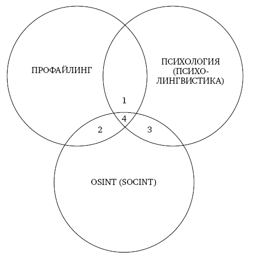 В работе были рассмотрены концептуальные положения из следующих областей знания: профайлинга, психологии и интернет-разведки, взаимопроникновение которых представлено на рисунке 50.