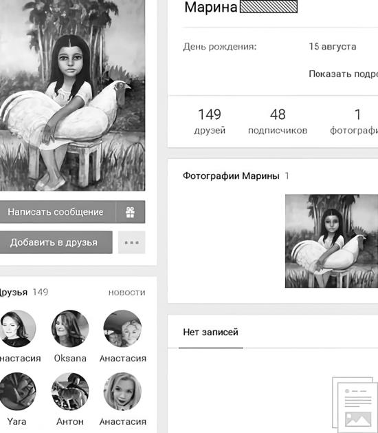 Анализ никнейма. Во-первых, используются никнеймы типа «ники-имена», из которых добываются и уточняются формальные идентифицирующие сведения (имя, фамилия). Во-вторых, на странице «без друзей» используется никнейм типа «ники-фразы» («Марина в поисках счастья»), анализ которого как статусной реплики даёт все основания говорить о передаче владелицей страницы актуальной личностной информации о поисках своего счастья, что коррелирует со значением аватара другой страницы («Девочки с курицей»/материнский инстинкт, продолжение рода).