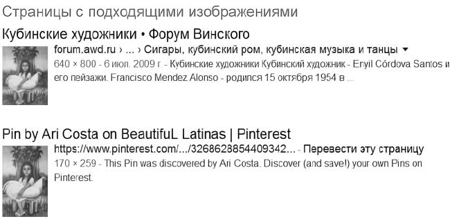 Поиск по изображению аватара «Девочка с курицей» с помощью сервиса Tineeye (URL: https://www.tineye.com) не дал результата, однако с помощью поиска по картинке в Google (URL: https://www.google.ru/imghp?hl=ru) удалось узнать, что это работа кубинского художника (рисунок 17).