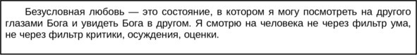 Безусловная любовь – это безоценочное состояние, когда я подхожу к человеку и просто принимаю. Радуюсь его присутствию, его уникальности, восхищаюсь талантами. Мне очень повезло обладать способностью видеть в человеке плюс, а не минус. В одной из мудрых книг написано: «Самый большой грех видеть дьявола в человеке, а не Бога».
