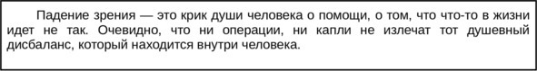 Каждое заболевание глаз тоже имеет свою расшифровку: и катаракта, и отслойка сетчатки, и атрофия зрительного нерва. Я не буду в этой книге описывать медицинскую часть, потому что слишком много нюансов, да и чтобы не сбить читателя с пути. Просто приглашаю на программу «Прозрение души», на живой тренинг или онлайн-вариант чтобы максимально грамотно и безукоризненно точно ответить на вопрос, почему у вас падает зрение и двинуться обратно в сторону восстановления базовых природных настроек 100%-го зрения. И все же какое-то представление вы уже получили и теперь знаете, что острота зрения напрямую зависит от психотравм, полученных в этой жизни или в роду. Бабушки часто передают программы «Не хочу видеть» своим дочерям, а те в свою очередь – ребенку, и количество этого «Не хочу видеть» плавненько переходит все дальше и дальше, перерастая в качество зрения у потомков. Поскольку стрессовые ситуации сейчас растут и множатся ежесекундно, естественно, что уже в школе практически половина класса сидит в очках. Причем, надев очки, крайне сложно восстановить зрение, потому что это равносильно тому, что человек берет костыли и говорит: «У меня ноги не ходят, я теперь буду опираться на костыли». Очки – это тоже костыли.
