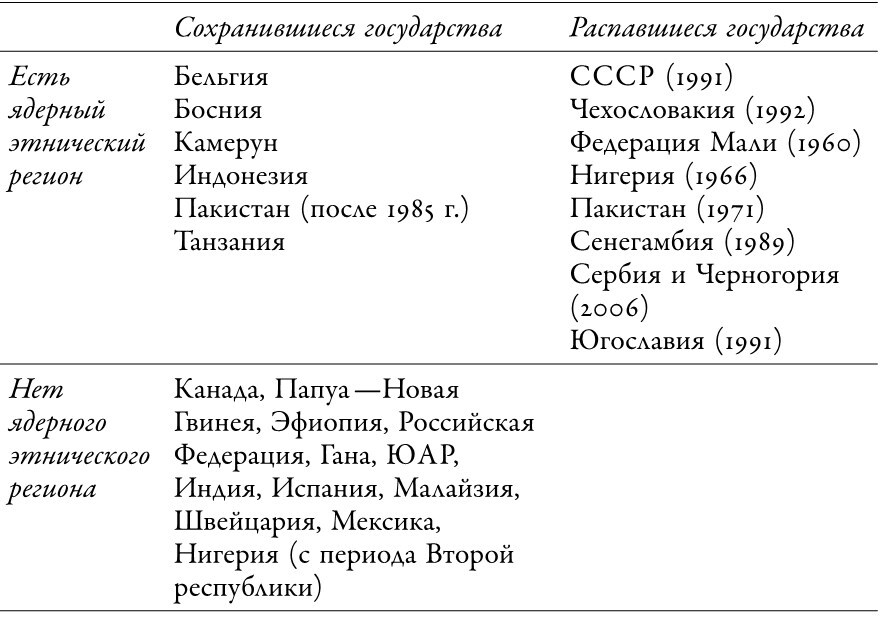 Как видим, наблюдается жесткая закономерность: во всех распавшихся государствах существовал ядерный этнический регион, в то время как все те государства, где его не было, сохранились. Некоторые из этнофедеративных государств с ядерным регионом существуют до сих пор, но все они числятся среди самых нестабильных полиэтнических стран мира: к ним относятся, в частности, Босния (которую, по сути, «скрепляет воедино» только присутствие натовских войск) и Бельгия. Более того, в категории «выживших» есть государства, где федеративное устройство было упразднено (то есть этнофедерализм не сохранился, но это не привело к их распаду) – таковы, например, Индонезия и Камерун. При этом ни один другой признак, кроме наличия ядерного этнического региона, не позволяет столь же четко разделить эти государства на «погибшие» и «выжившие».