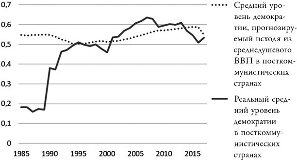 В результате с 1870‐х годов эти страны все больше отставали от Запада. К 1980‐м уровень демократии в странах советского блока был намного ниже ожидаемого, учитывая уровень доходов (см. график 3). А в начале 1990‐х они быстро приблизились к уровню электоральной демократии, прогнозируемому на основе их уровня экономического развития. Затем, после некоторой паузы, он снова резко вырос в начале нулевых, превзойдя прогнозируемый уровень, потом вернулся к нему и, наконец, вновь слегка его превысил. Если сравнить реальный уровень либеральной (а не электоральной) демократии с уровнем, прогнозируемым на основе экономического развития, результаты будут теми же, разве что реальный уровень к 2017 году падает на 0,8 пункта ниже прогнозируемого.