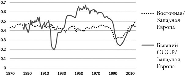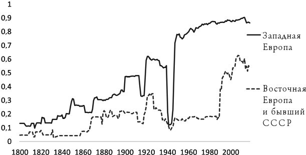 Один из самых давних и укоренившихся постулатов политологии состоит в том, что – за некоторыми исключениями, связанными, например, с государственной собственностью на нефтяные ресурсы, – более высокий уровень национального дохода коррелирует с более демократическим государственным устройством (классическая формулировка проблемы принадлежит Сеймуру Мартину Липсету). В полном соответствии с этим принципом Восточная Европа со времен промышленной революции отставала от Западной не только по уровню экономического развития, но и по уровню открытости и подотчетности политической системы. На графике 2 сравнивается средний уровень электоральной демократии в странах Западной Европы и в странах Восточной Европы и бывшего СССР. В Западной Европе уровень электоральной демократии в целом повышается с начала XIX столетия, с временными «паузами» из‐за двух мировых войн. На Востоке, однако, этот показатель в период с 1870 по 1989 год «застыл на месте»: временный его рост наблюдался лишь в межвоенный период.
