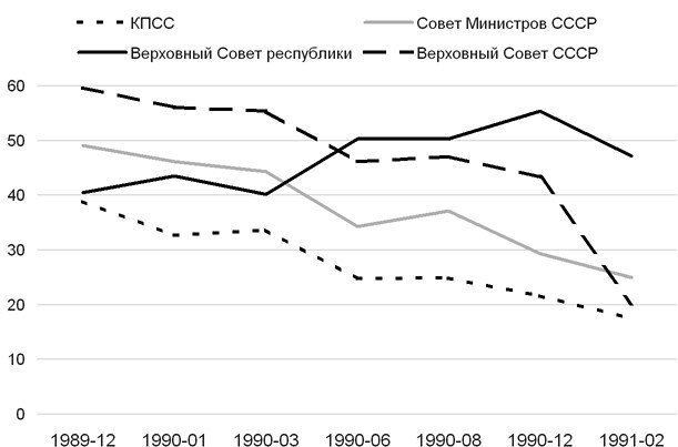 Таким образом, бенефициарами выборов 1989 и 1990 годов становились либо «новые политические силы» – оппозиционные демократические и националистические деятели и движения, получавшие легальный властный статус, либо старые элиты, сумевшие не допустить оппозицию на политическую сцену и обретавшие дополнительную, электоральную легитимность и навыки электорального доминирования. В результате при любом исходе: полная победа оппозиции, полная победа старой элиты или промежуточные сценарии – новые республиканские Верховные Советы, обретая новую электоральную легитимность и политическую субъектность, начинали принимать декларации государственного суверенитета, стремились консолидировать республиканский аппарат власти и расширить контроль над ресурсной базой и политическими процессами. Этот «переток легитимности» от центральных органов к республиканским хорошо виден в опросах общественного мнения: в то время как уровень доверия к республиканским Верховным Советам в 1990 году вырос с 40 до 50 пунктов, доверие к союзным структурам снизилось с уровня 50 пунктов (в среднем) в конце 1989 года до 20 пунктов в начале 1991-го.