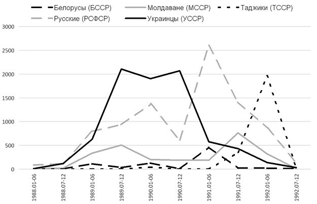В четырех других республиках, где оппозиция не сумела оказать существенного влияния на итоги «учредительных» выборов 1990 года (группа III-A в таблице 1: Киргизия, Таджикистан, Азербайджан, Белоруссия), старые элиты, сохранившие политический контроль, не были консолидированы. Их хрупкие коалиции распадались под влиянием новой волны массовой мобилизации и кризиса союзных структур власти. Как видно из таблицы 4, в то время как в одних республиках уровень массовой мобилизации в периоде после выборов 1990 года резко падает (это Армения, Латвия, Литва, Эстония, Грузия, где оппозиция фактически одержала победу), в других он остается на высоком уровне или даже возрастает (Молдавия, Украина, Россия), а где-то массовая мобилизация или ее подобие впервые происходит именно в этом, втором, периоде (Белоруссия, Таджикистан, Киргизия; см. график 2). Важнейшим фактором мобилизации второй волны являлся нараставший экономический кризис, приводивший под знамена оппозиции (какими бы они ни были) новые массовые контингенты.