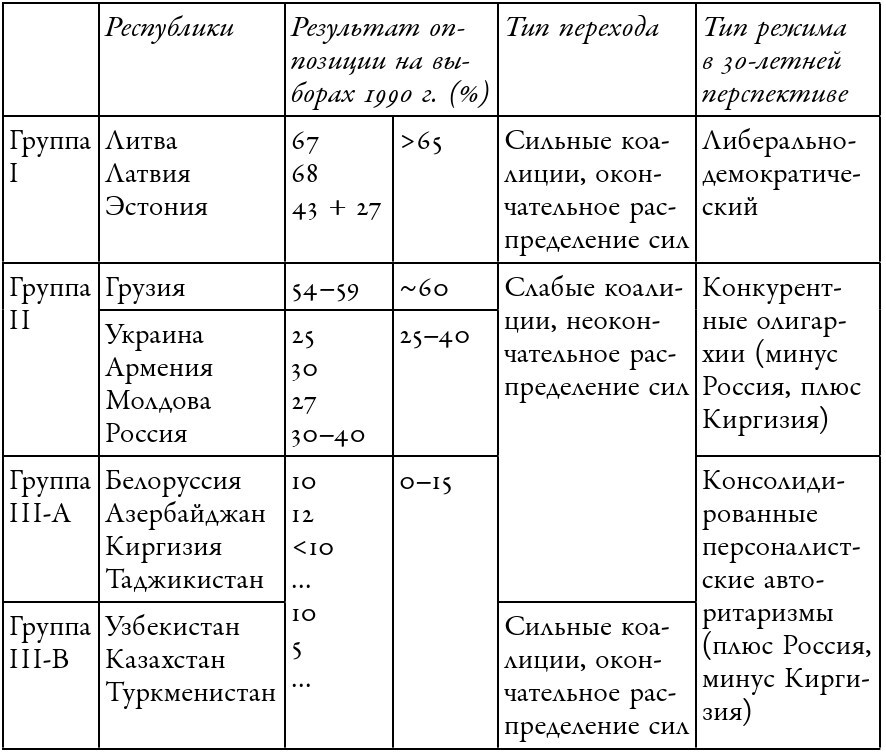 Страны первой группы продемонстрировали распределение сил, которое в дальнейшем не пересматривалось: демократия осталась здесь «единственной игрой в городе», а режим в целом можно считать либерально-демократическим (несмотря на то что русское население было частично поражено в правах). Страны третьей группы, за одним исключением (Киргизия), на протяжении большей части своей постсоветской истории оставались авторитарными и сегодня являются консолидированными персоналистскими авторитаризмами. При этом в трех из них это положение дел, определившись на выборах 1990 года, никогда не менялось (группа III-B: Казахстан, Узбекистан, Туркменистан). В четырех остальных, хотя оппозиция и не сумела оказать значимого влияния на исход выборов 1990 года, сохранившая доминирование старая коалиция оказалась недостаточно сильной и теряла власть, однако уже во второй половине 1990‐х здесь происходило восстановление сетей патронажа и авторитарной системы управления (группа III-А: Азербайджан, Белоруссия, Киргизия, Таджикистан).