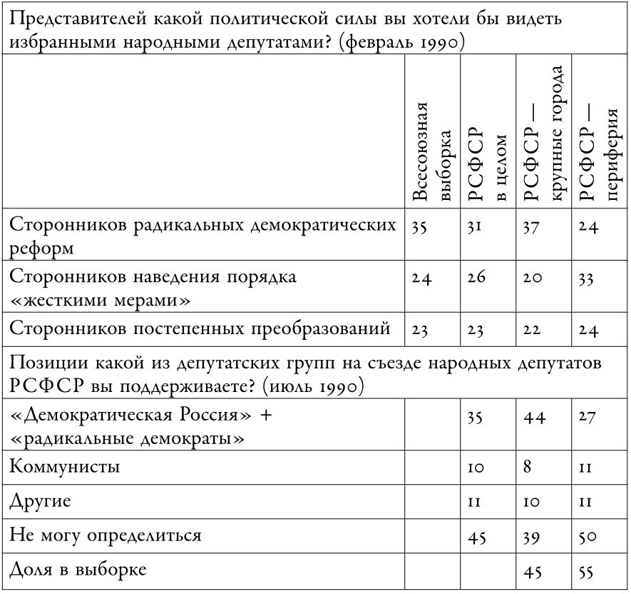 На выборах 1990 года демократическая коалиция получила, по разным оценкам, от 20 до 35% мест. Ответственный за РСФСР в политбюро, глава прежнего Верховного Совета РСФСР Виталий Воротников уверял Горбачева, что оппозиция имеет 20–25% мандатов; анализ голосований на съезде по разным процедурным вопросам показывал, что демократов могут поддержать в некоторых ситуациях до 40–45% депутатов (Субботин, Шейнис). При этом в Москве демократы выиграли 85% мандатов, а в периферийных, сельских районах и в национальных республиках ситуация была противоположной. Этот электоральный профиль России сохраняет в значительной мере актуальность и сегодня. Если на пространстве бывшего СССР модели электорального поведения располагаются между двумя полюсами – продвинутым Западом (Прибалтика) и восточной моделью центральноазиатских республик, то на территории России мы наблюдаем подобие обоих полюсов.