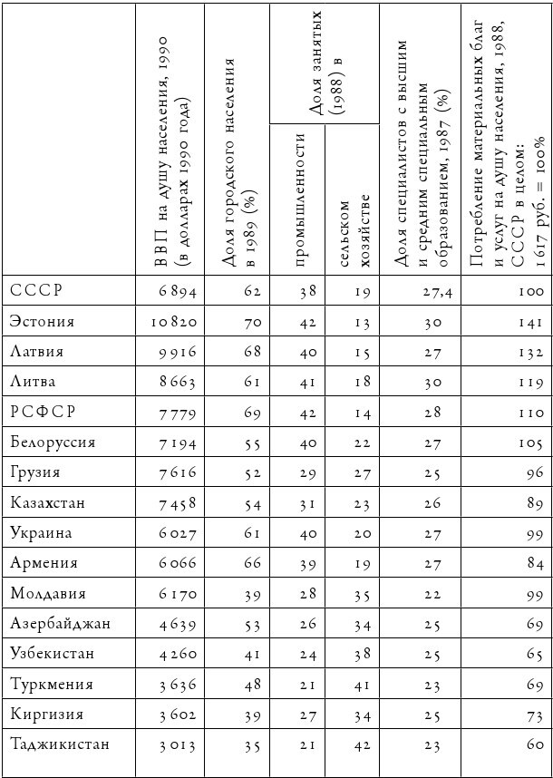 Действительно, в конце 1980‐х ВВП на душу населения в Прибалтийских республиках (8600–10 800 долларов в долларах 1990 года) соответствовал уровню таких государств, как Португалия, Греция, Чехословакия; в России, Белоруссии, Грузии и Казахстане он соответствовал уровню Словакии, Хорватии, Венгрии (7200–7800 долларов); в Молдавии, Армении и Украине – уровню Чили, Мексики, Сирии и Болгарии (6000–6200 долларов); наконец, наиболее бедные (Азербайджан, Узбекистан, Туркмения, Киргизия, Таджикистан) находились в одной группе с Таиландом, Ираном, Румынией и Ливией (3000–4600 долларов). В то время как доля городского населения в Эстонии, России и Латвии составляла почти 70%, в отстающих Таджикистане, Киргизии, Молдавии, Узбекистане она была практически вдвое ниже (35–40%). Если в продвинутых республиках в промышленности было занято 40% рабочей силы, а в сельском хозяйстве 13–20%, то в Таджикистане, Туркмении, Узбекистане ситуация была практически обратной. Существенно различается и доля высококвалифицированной рабочей силы в экономике: в лидирующей группе она составляет 28–30%, а в наименее развитых республиках – 22–23% (такой уровень наблюдался у лидеров примерно на 10 лет раньше). Уровень потребления материальных благ и услуг в лидирующей и отстающей группах также различался в два раза (см. таблицу 3).