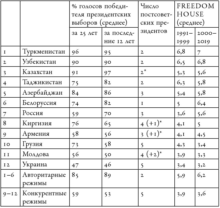 Выявленная взаимосвязь между исходом выборов 1990 года и типом режима в постсоветском периоде имеет два исключения: Киргизия – страна, где оппозиция не оказала влияния на исход выборов в 1990 году, – развивалась до начала 2000‐х как персоналистский авторитаризм центральноазиатского типа, однако с середины 2000‐х перешла в класс «конкурентных олигархий». И наоборот, Россия – страна, где оппозиция сумела добиться существенного успеха на выборах 1990 года, до начала 2000‐х демонстрировала многие черты «конкурентных олигархий», но затем перешла в группу персоналистских авторитаризмов. Это обстоятельство не подрывает базовой гипотезы, но лишь указывает на наличие дополнительных факторов, способствующих или препятствующих консолидации авторитарного режима.