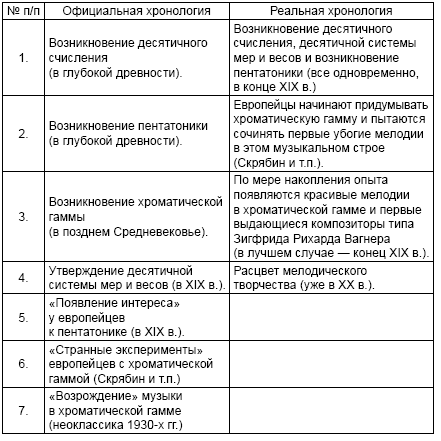 Таким образом, странности официальной истории музыки указывают на то, что пентатоника (как более простая система, явно связанная с десятичной системой мер) возникла лишь в XIX в., а хроматическая гамма (как более сложная) возникла позже. Таким образом, подлинная история музыки началась не раньше конца XIX в.