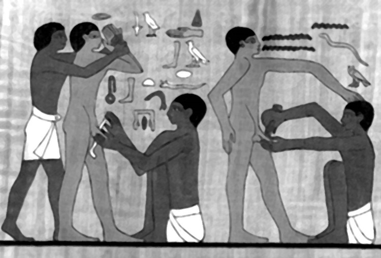 Именно это занятие изображено на указанном «древнеегипетском изображении». На картинке просто нарисовано, как «старослужащие» (загорелые солдаты) помогают диагностировать и лечить венерические болезни у своих неопытных сослуживцев (призывников-первогодков, не успевших загореть на солнце).