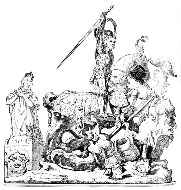 Отрубание трех голов змея – это, якобы, насмешка над упразднением 4-палатного парламента, и введением равенства сословий. А «Святой Георгий» – это, якобы, насмешка над министром по фамилии Де Геер.