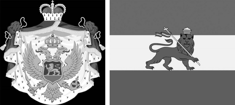 Легко видеть, что имеется один и тот же геральдический элемент – идущий на четырех ногах лев. Лев на гербах всех других стран – или стоит на двух ногах, или сидит. То есть, идущий на четырех ногах лев – это редкий элемент, присутствующий только у «негусов» и «Негошей».