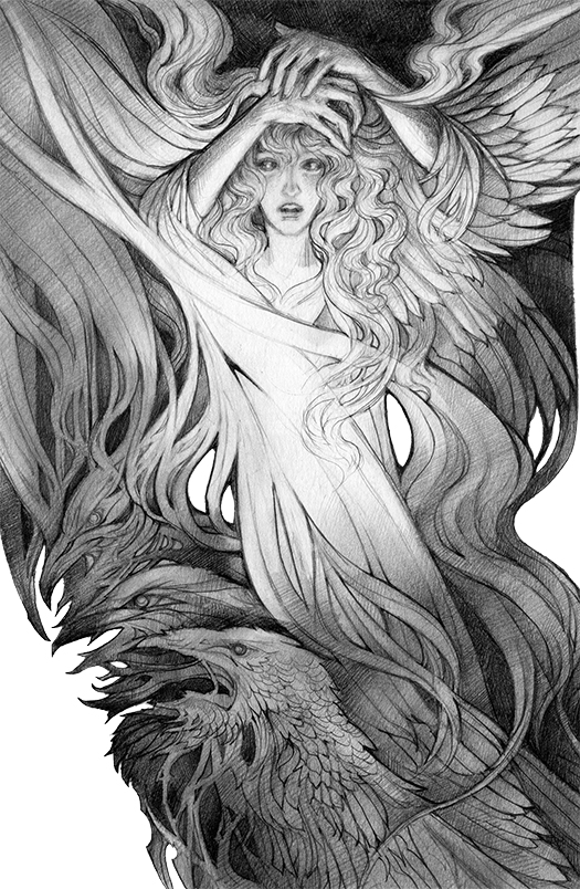 Вдруг конь его стремительно прянул вперед и в ужасе заржал: над ним нависло крыло тьмы. Послышался пронзительный вопль. В нем слышался не испуг, но гнев и боль: он вобрал в себя ужас, и страх, и ярость всех сражений на свете; этот крик разжижал внутренности и леденил кости. Лошади, его заслышавшие, на миг сходили с ума, а в душах людей поселялся одуряющий страх. Гай выпустил поводья, выронил копье и судорожно вцепился в конскую гриву; мир стремительно завращался вокруг него. Перед глазами Гая возник лик Фурии в обрамлении шевелящихся и извивающихся блестящих волос.