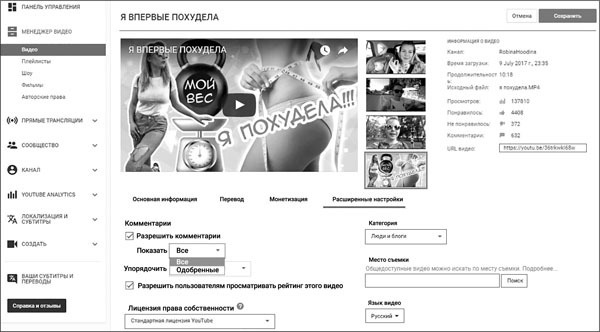 Рис. 12. Возможность модерировать комментарии или скрывать их в настройках видео