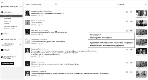 На YouTube есть такая замечательная функция в настройках сообщества, в настройках канала, как черный список и фильтр каких-то слов. Можно в Интернете найти «черный список слов», внести туда самые плохие слова, и все комментарии, которые содержат эти слова, автоматически будут скрыты. При желании вы можете их просмотреть, они будут находиться во вкладке «на рассмотрении», но другие пользователи их видеть не будут. То есть как только человек оставляет комментарий, где содержится слово из списка, который вы ввели в фильтр в ваших настройках, так сразу же комментарий будет удаляться, но формально он будет просто в невидимой вкладке.