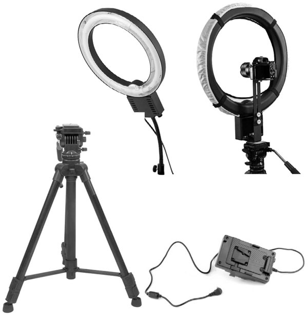 Можно также использовать светодиодное освещение в виде кольца. Очень хорошая вещь. Занимает значительно меньше места, чем софтбокс. Светодиоды расположены на кольцевидной металлической основе. Они направляют рассеянный свет на лицо и дают довольно большую площадь освещения, также у них есть регулировка яркости – то есть можно получить и слабый свет, и очень сильный прожектор (рис. 19).