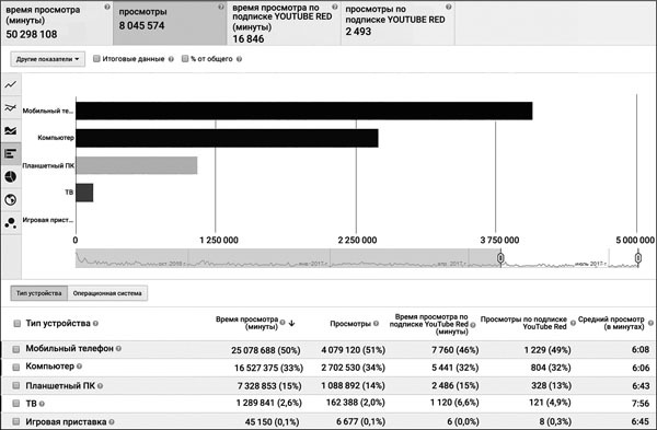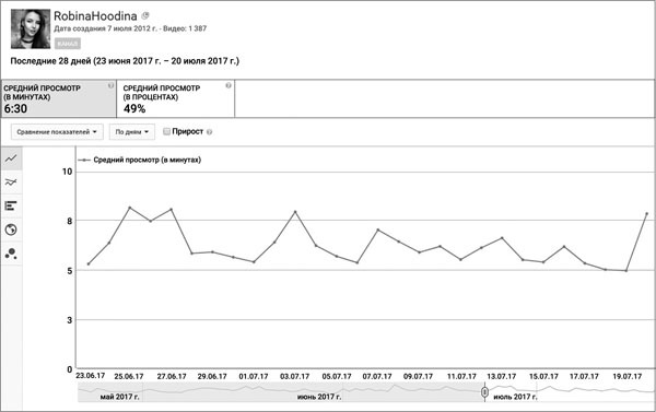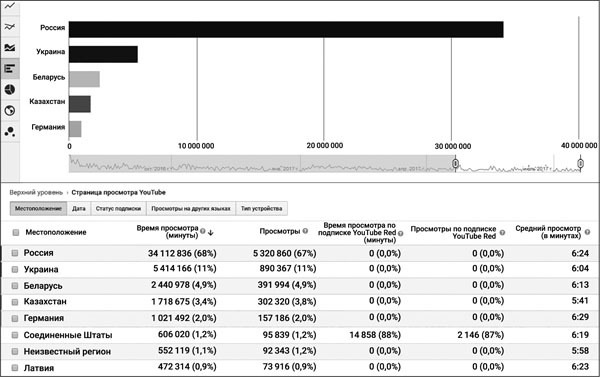 У меня 75 % зрителей находятся в диапазоне 18–35 лет, соотношение мужчин и женщин – примерно 90 % женщин и 10 % мужчин. Конечно, эти показатели плавают, но в целом тенденция ясна. Держите готовые скриншоты статистики под рукой, и, если поступит какое-то рекламное предложение, вы сможете оперативно ответить, на каких условиях вы работаете, прикрепив скриншоты статистики, тогда шансов, что будет положительный результат, намного больше. Также может пригодиться «геостатистика», то есть раскладка ваших зрителей по странам. Ну и для некоторых брендов важны устройства, на которых воспроизводят ролики, а также удержание аудитории (рис. 20, 21, 22).