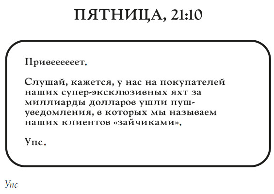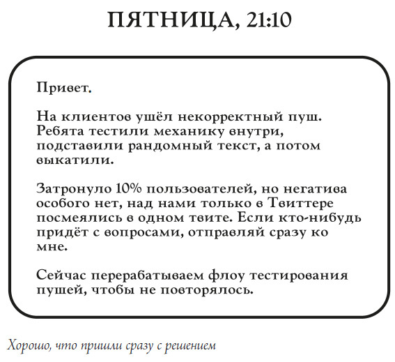 Это небольшое лирическое отступление о том, как мы все ошибаемся и иногда (или довольно часто) переживаем. То, что выделяет каждого конкретного человека в момент факапа – это то, что он делает сразу после своей ошибки. Здесь подходов также может быть великое множество – ошибки уникальны, как и провалы: от замалчивания проблемы до проактивного решения. Если вы читаете эту книгу, то, наверное, вы понимаете, что попытки «замести следы» под ковёр – худшая из возможных стратегий. Поэтому мы перейдём сразу к решениям и дадим конкретный алгоритм действий.
