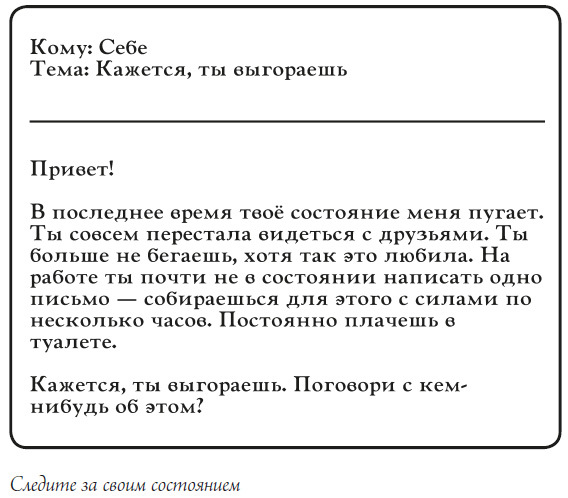 • определите для себя триггер усталости: например, чего вы не делаете, когда чертовски устали. Например, вы перестаёте краситься, читать, ходить на спорт. Может, вы перестаёте читать книги и целыми вечерами смотрите телешоу? Этот триггер усталости станет вашим маяком – отслеживайте его, и вы буквально увидите, когда усталость подступает. Иногда кажется, что ничего особенного – я перестал(а) бегать по утрам, потому что просто нет времени. Но потом вы находите себя в страшнейшей степени выгорания;