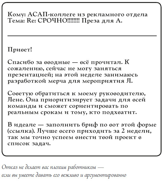Да, но… (Да, и…) Это один из вариантов коммуникации, когда категоричный отказ кажется невозможным. Предложите перераспределить приоритеты: я могу помочь тебе с этой задачей, если ты снимешь с меня ту, что давал(а) мне ранее. Или так: сейчас всё моё внимание – на задаче от твоего коллеги Саши; если ты поговоришь с ним и объяснишь, что твой проект реально в приоритете и Саша будет не против, я, конечно, переключусь. Это хорошо работает, когда ваша функция в компании – скорее «исполнительная» (например, вы пишете тексты для разных «заказчиков» внутри компании). Это как раз способ отказать вот во всех этих проверках презентаций и вычитках. Я проверю твою презентацию, если ты возьмёшь на себя мой отчёт и доделаешь его.