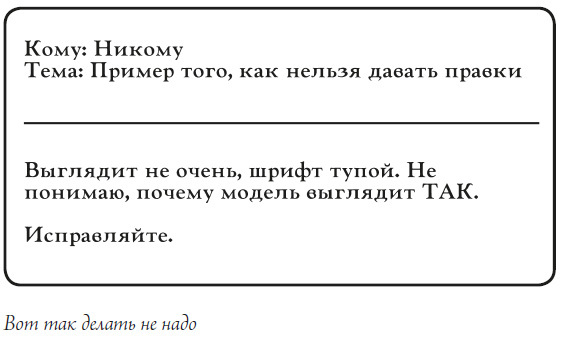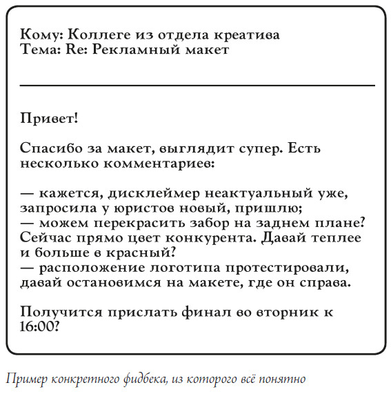 • четкий и прозрачный: не поиграть со шрифтами, попробовать другой цвет и «что-то как-то не того». Такой фидбек – вещь, с которой совершенно непонятно, что делать и зачем. Фидбек должен быть максимально прозрачным, специалист должен выйти из него с пониманием, что нужно поправить, зачем и как быстро. Не «переделайте всё до завтра», а «поправь, пожалуйста, фотозону по комментариям (список комментариев), придумайте еще пару вариантов привлечения людей в эту активацию, ДЛ по задаче до конца недели». Так человеку понятно, что ему нужно сделать;