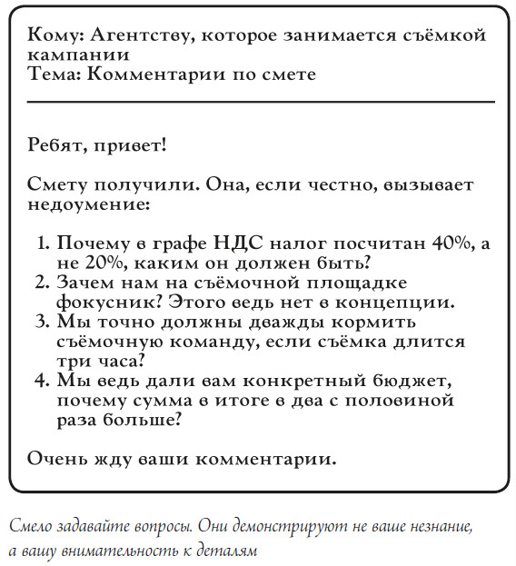 Впрочем, это относится и к вашим ответам на чужие письма. Если вам прислали письмо с тремя пронумерованными вопросами, ваш ответ «да, спасибо» можно будет справедливо принять как неуважение. Вы ответили да на всё или на что-то конкретное? Или просто увидели, что я прислал(а) вам письмо и решили так меня за него поблагодарить? Даже если ваше «да» – это «да» на всё, потрудитесь так и написать: «Спасибо за вопросы, ответ на все три – да». Всего шесть дополнительных слов, а стало сильно понятнее. Если у вас нет возможности сейчас дать ответ – так и напишите и пообещайте вернуться в конкретный день и время.