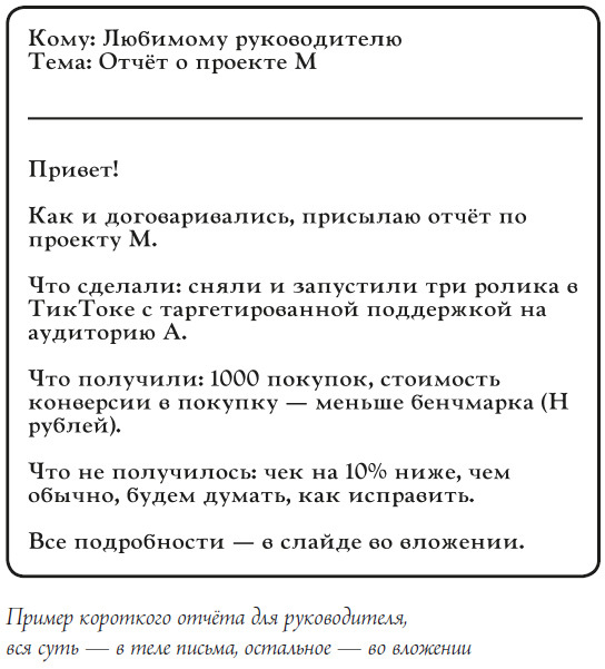 Бывшая руководительница одной из авторок не принимала презентации без тайминга и бюджетов, а отчёты – без дальнейших шагов и выводов. Первое время это бесит, потом осознаёшь, сколько вопросов это срезает.
